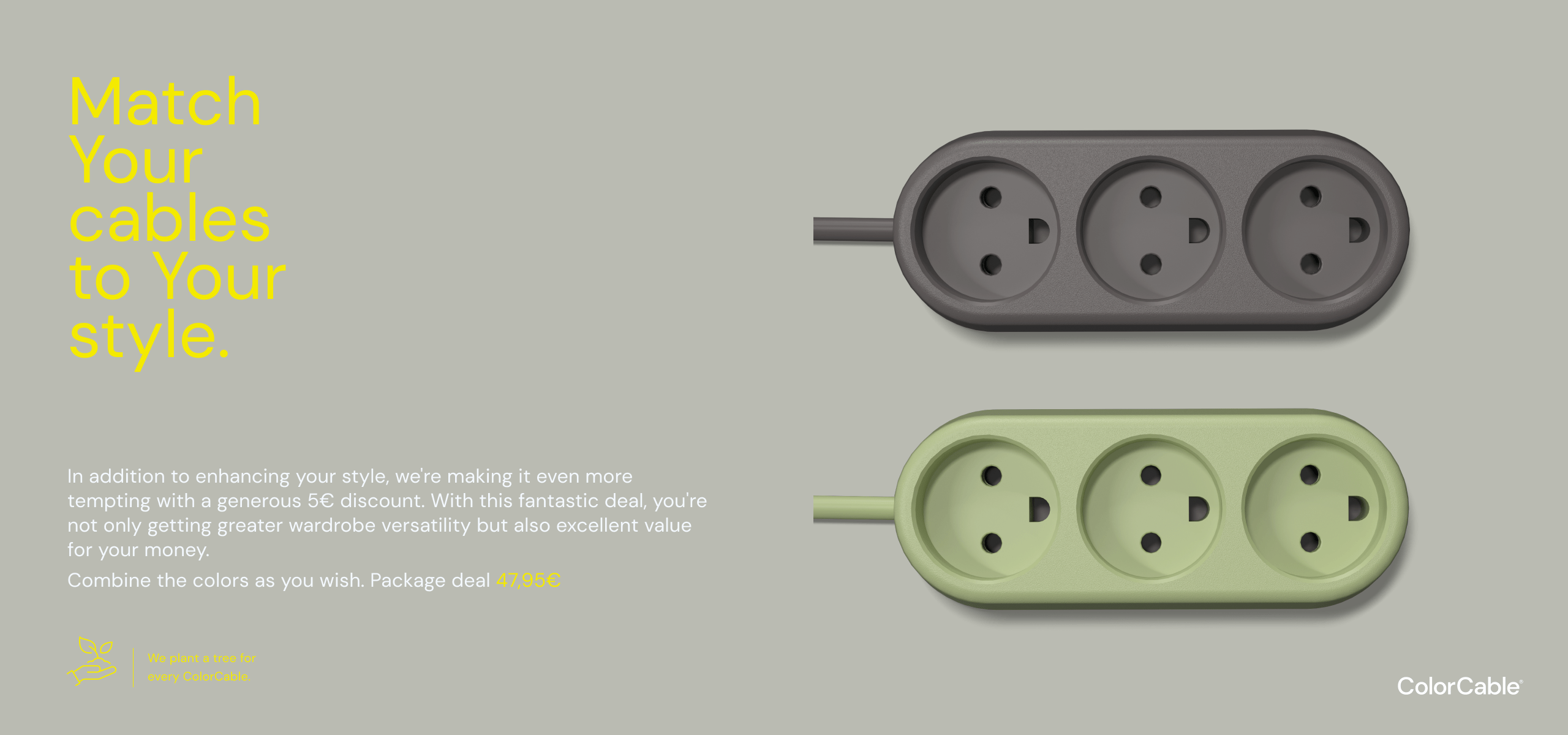 ColorCable Model 3 powerstrip.Greenish shades are natural and exclusive - graphic and energetic. Be artful, be mood making, be sustainable.- In Stock. - Full Return policy. - 30% Recycled materials. - Shipment within 24 hours.