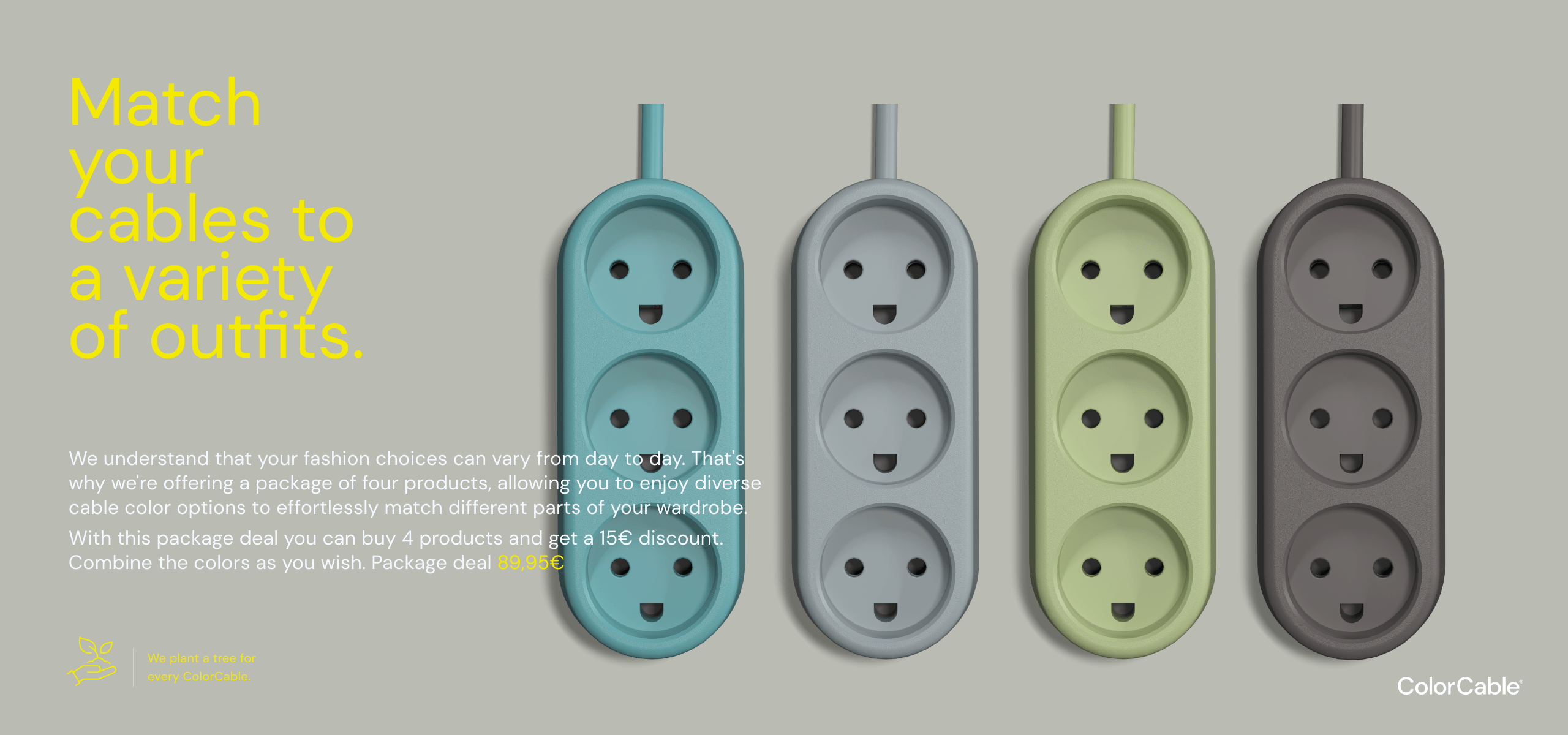 We understand that your fashion choices can vary from day to day. That's why we're offering a package of four products, allowing you to enjoy diverse cable color options to effortlessly match different parts of your wardrobe. With this package deal you can buy 4 products and get a 15€ discount. Combine the colors as you wish. Package deal 89,95€